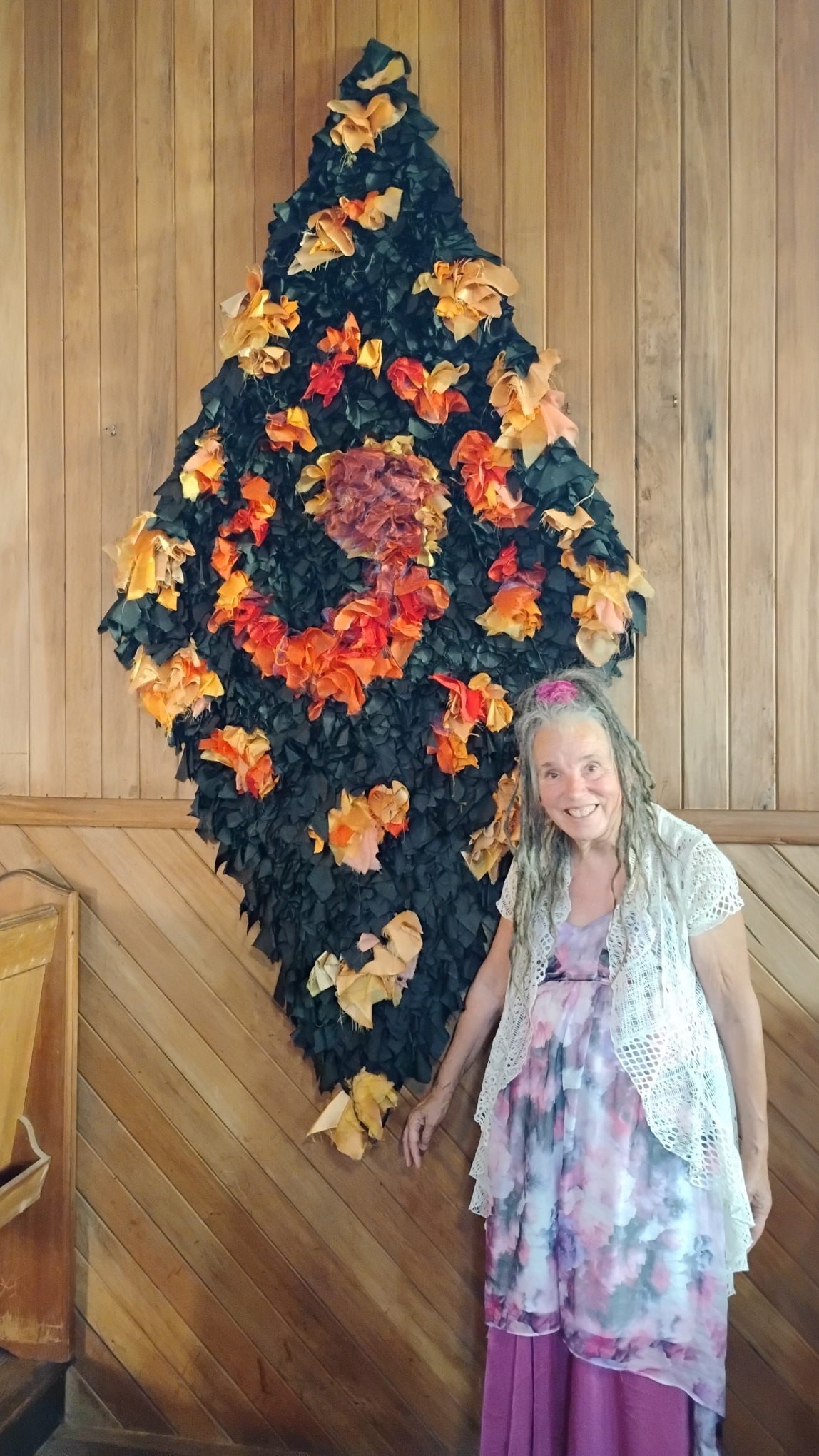 Helensville artist, Pauline Denton, exhibited her huge fabric work called “Passion” which depicts Jesus at the centre, his head and arms in deep fiery reds and his love and warmth radiating out in a spiral of flame like orange, red and gold colours. The piece comprises of hessian stretched over a large frame with fabric poked into it before the back is glued to tighten and secure it. The last four years have seen expressions of creativity and art celebrating the beauty and meaning of Easter. The exhibition is named “Suffering and Hope” and each artist has worked with this theme.
